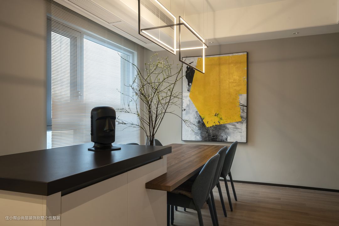 从硬装到软装,无不体现设计师的细致用心,以及居者的生活品味。现代几何造型的茶几,黑色的调性与整体环境形成对比,提升空间色彩对比度,更与整体现代气质完美搭配。