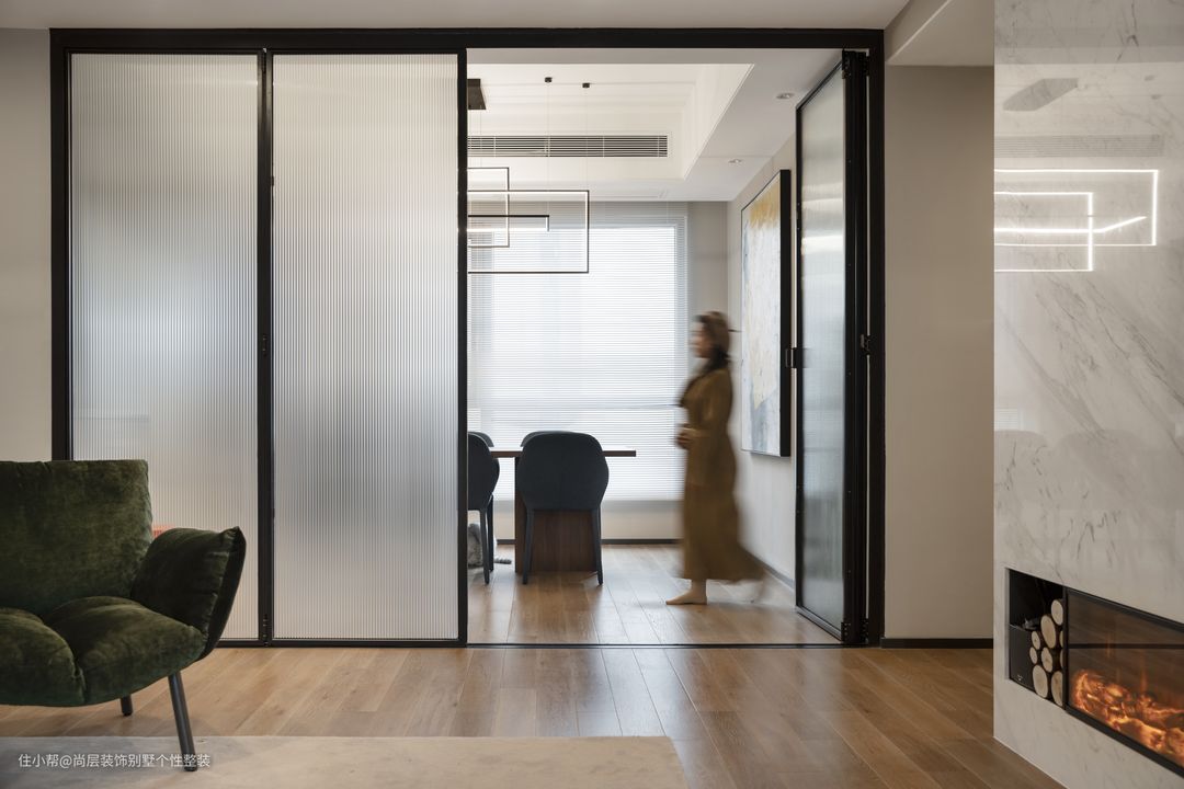 一层空间作为公共生活区域,在设计上保证了空间的连续性,餐厅与客厅相邻的空间结构,以推拉门作为空间隔断,自然将空间分割,又不影响空间动线,让两个空间既保持空间联系,又形成各自的空间独立性。