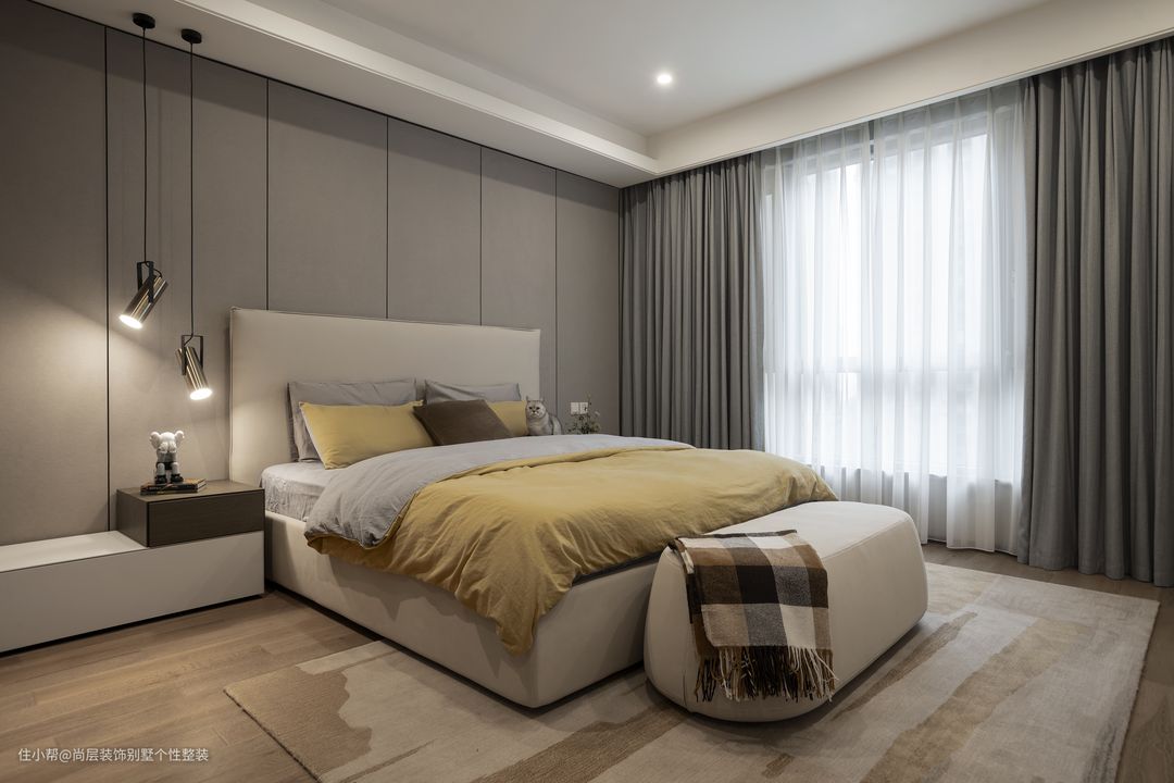卧室空间作为居者享受休憩之地,在设计上更倾向于淡雅色彩,也更加注重舒适度的考量。整体淡淡的色彩,渲染出高舒适度的视觉感受,搭配纹理自然木质地板,营造舒适的休息睡眠空间。书桌的设置,既可以作为阅读区域,也可作为居家办公空间。