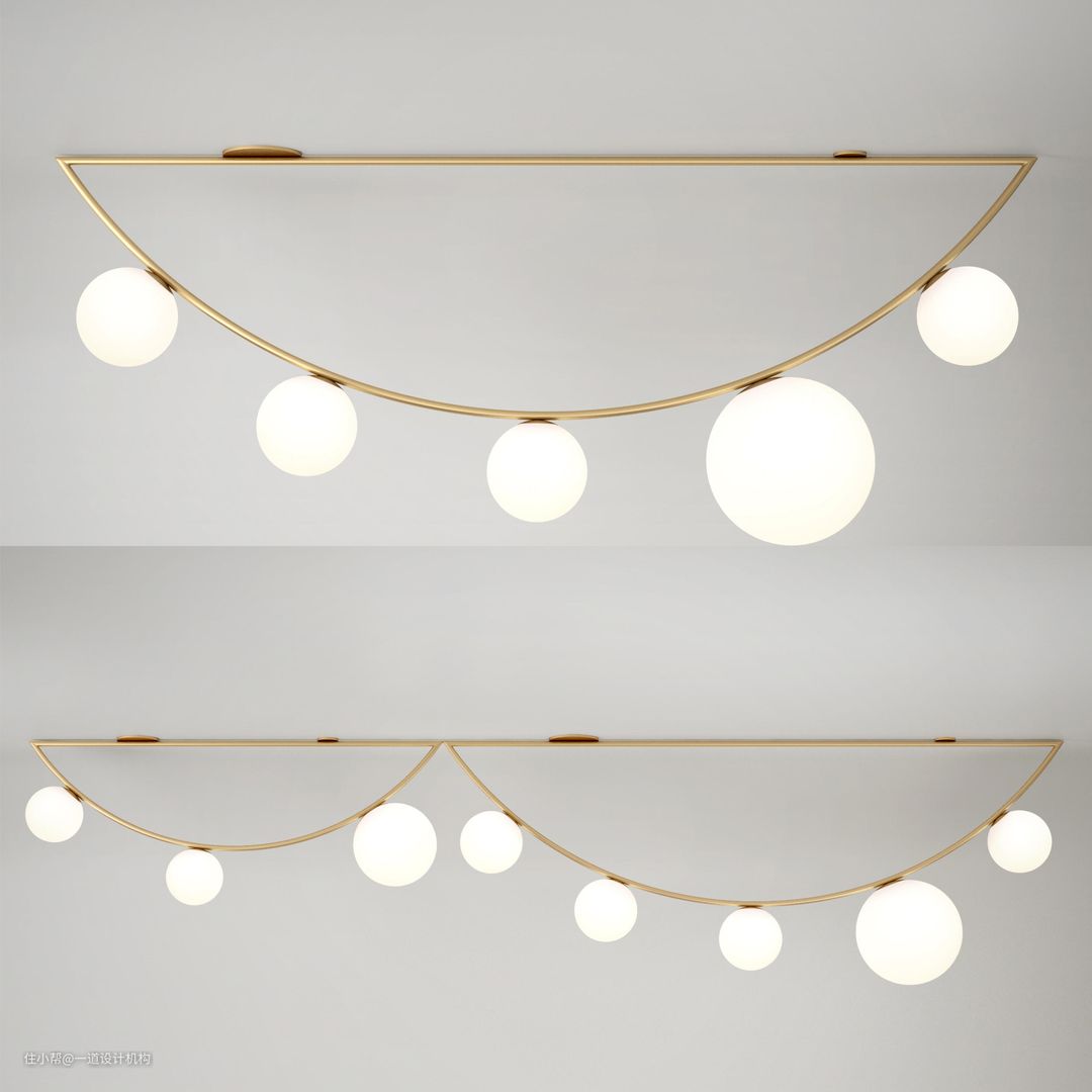 其实串灯在我们生活里十分常见,用在窗帘上增加气氛,但是很少有人用于空间的照明,其实我们改变一下大小与排列,就会显得更加现代简约,五个小圆灯里面突出一个最大的作为主光源,满足照明的同时,让造型更美观白搭,适合放在客厅或者卧室。