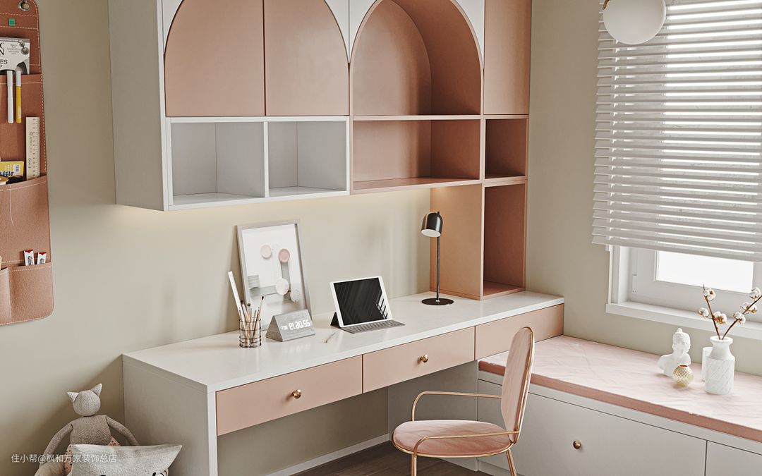 儿童房以粉色为主,定制了吊柜和书桌,供孩子学习使用。