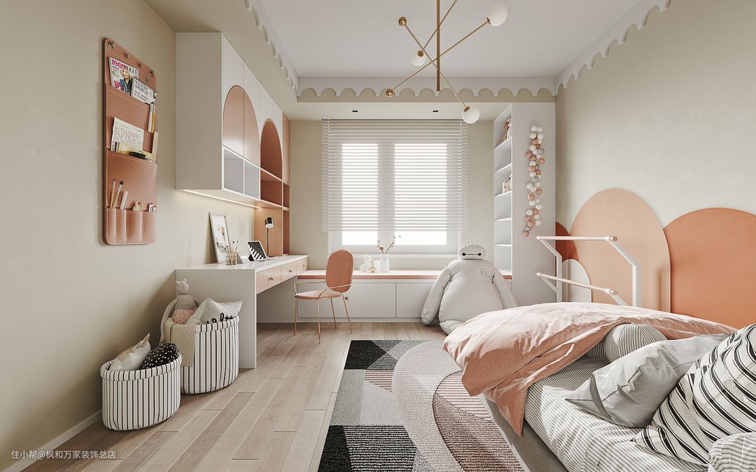儿童房的区域相比其它空间颜色要更加跳动、更加明亮。整体是粉色为主,墙面上透过窗户折射出白色的“阳光”温暖整个房间。