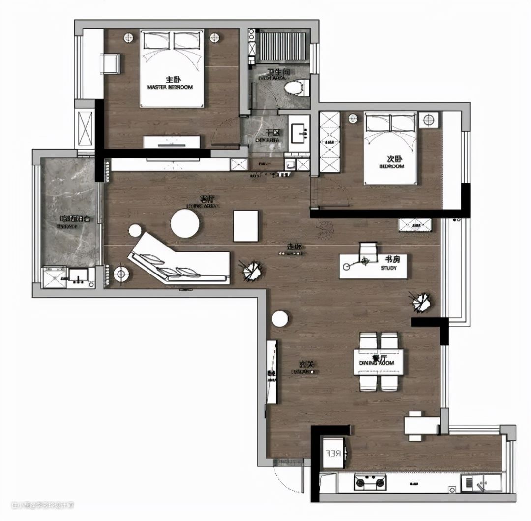 入户门正对卧室,直接将卧室的隐私暴露。在设计时,咱们可以结合整体户型改变主卧的布局,如《拾光》这个项目: