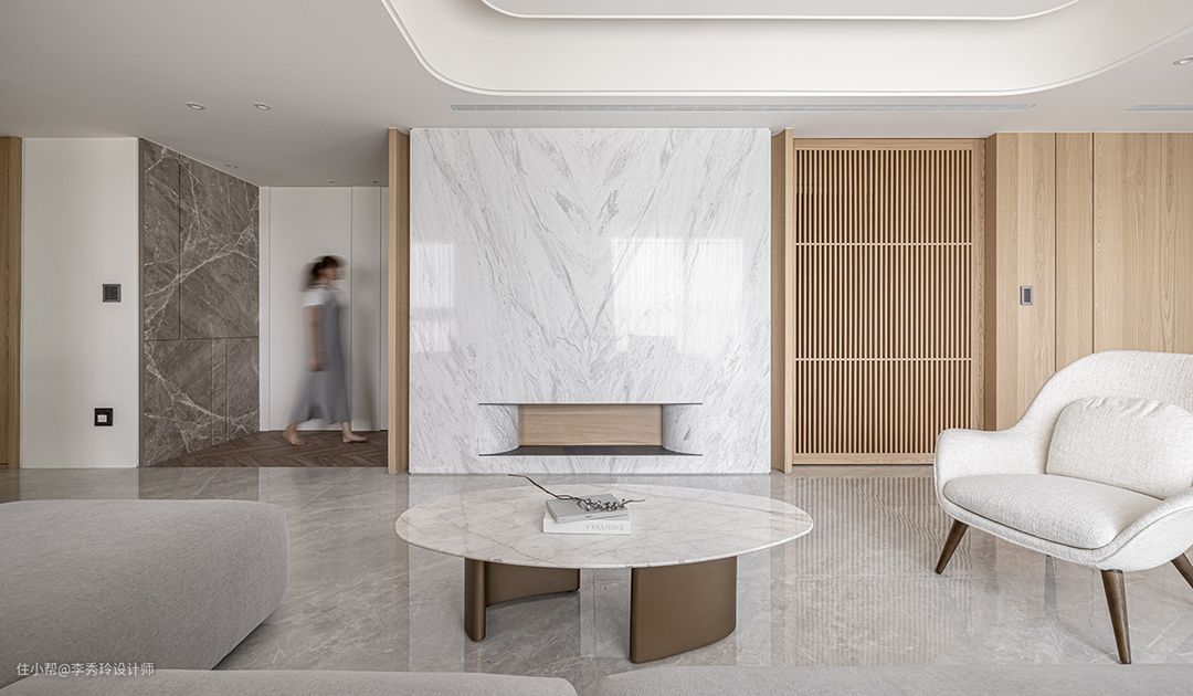 入户门居中,客餐厅分列两边,这种情况下,若空间纵向深度够用,咱们可以选择平行于入户门的隔断遮挡隐私: