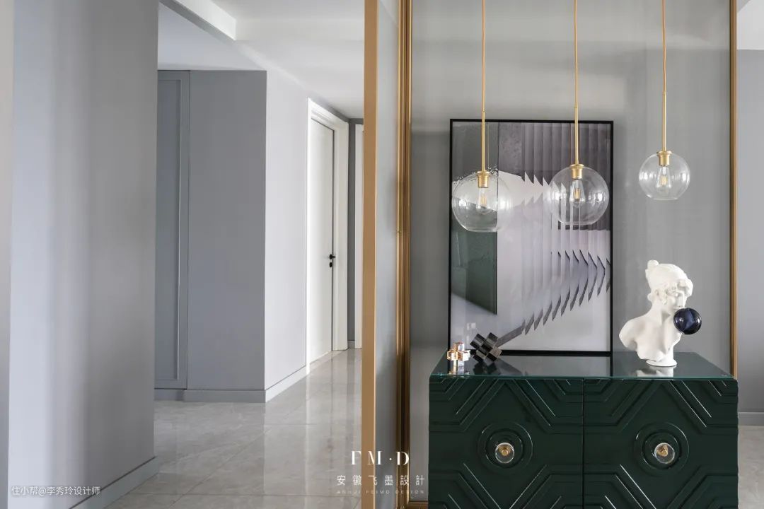 而衣帽间的墙体刚好形成一个独立的玄关空间,利用柜体+装饰画营造入户端景,既遮隐私又美观实用: