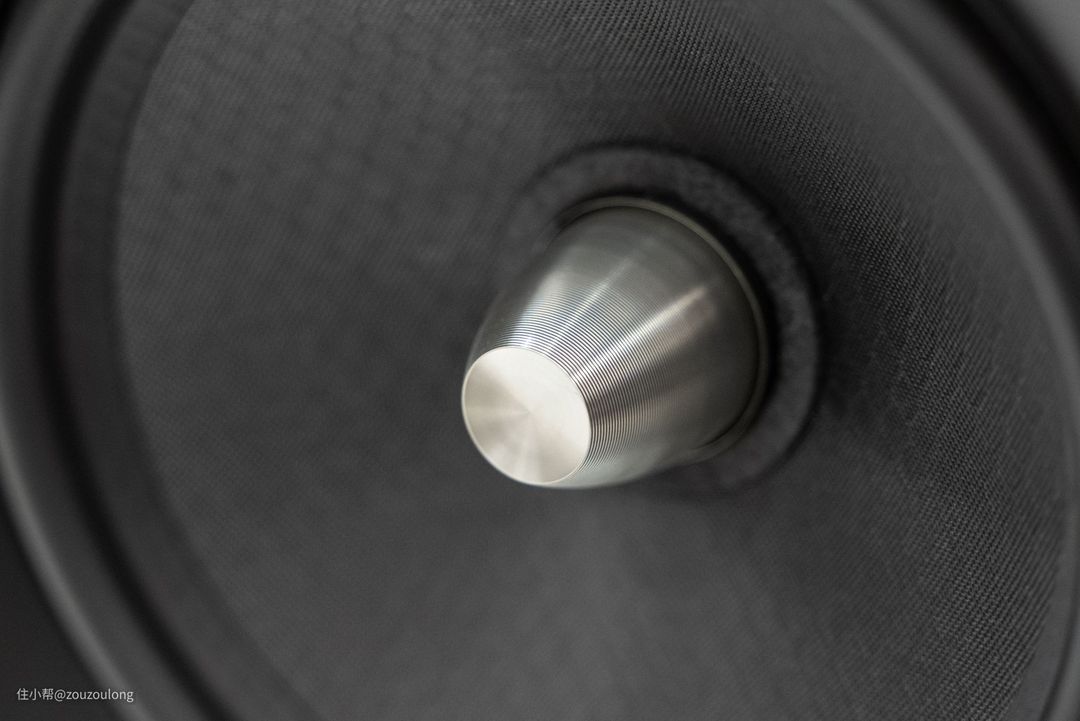 音箱背面除了金属漆涂装之外,面板还采用了拉丝质感的工艺,整个音箱表面都是满满的质感。除了接口,我们可以看到箱体上端还有个大圆孔,即倒相孔。音箱当然不是非得设置倒相孔不可,也可以采用全封闭结构。不过有倒相孔的音箱,效率比较高,低频特性也会比较好,而且还可以削减箱体体积,这对于书架箱这样中等体积的产品而言,无疑是很实用的。当然,倒相孔的效果好坏,很吃设计,是个精细活。