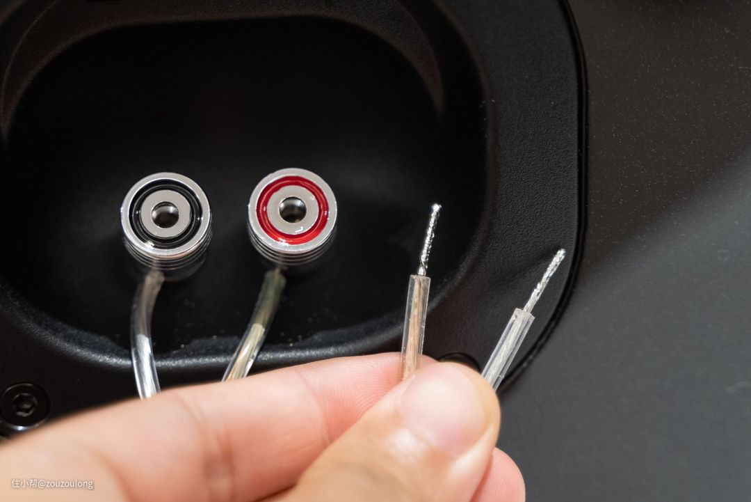尊宝C707PA主、副音箱需要通过副音箱线接口线接,当然,线材是贯通接线柱再拧紧固定,使用配好的线材扭上即可,也可以自行更换线材连接。