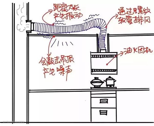 灶具和排烟口中间忌有梁,其一是排烟道的尺寸太大无法穿梁,绕梁就会多次转弯不仅影响排烟效果,还会损失吊顶高度(需要扩大吊顶尺寸容纳绕梁烟管)。