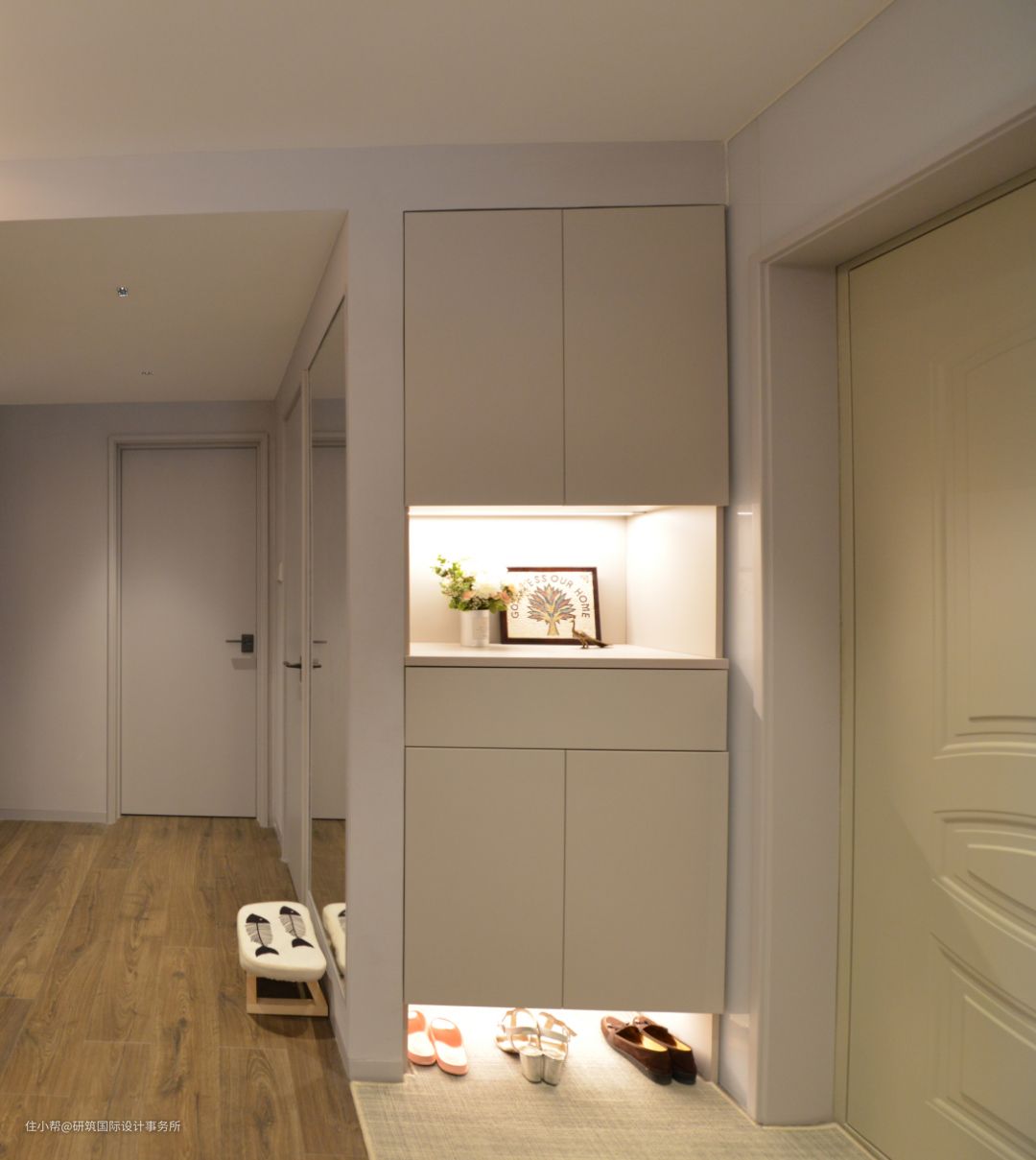 有藏有露的半开放式玄关柜,无把手的设计让玄关更显清爽。
