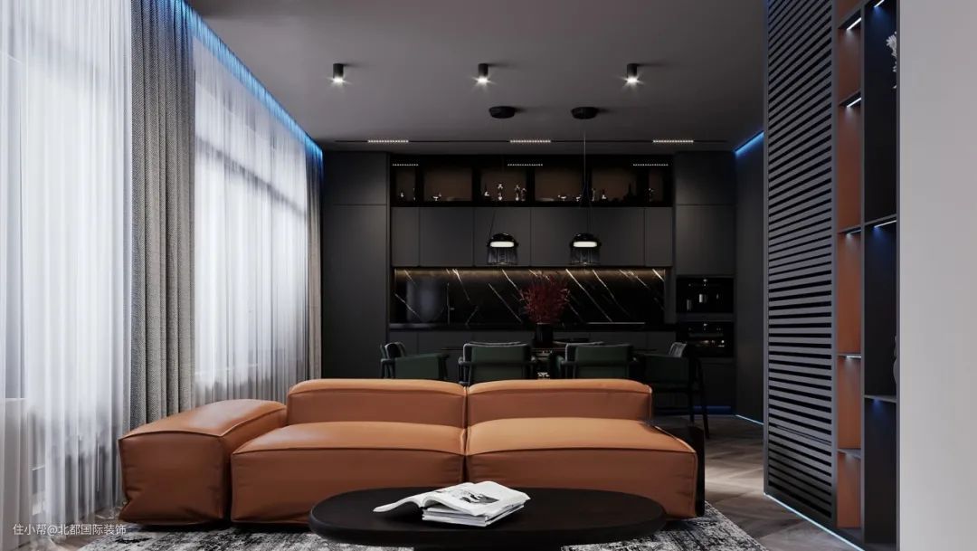 客厅无主灯设计加上很有特色的蓝色氛围灯,让室内空间充满高级感