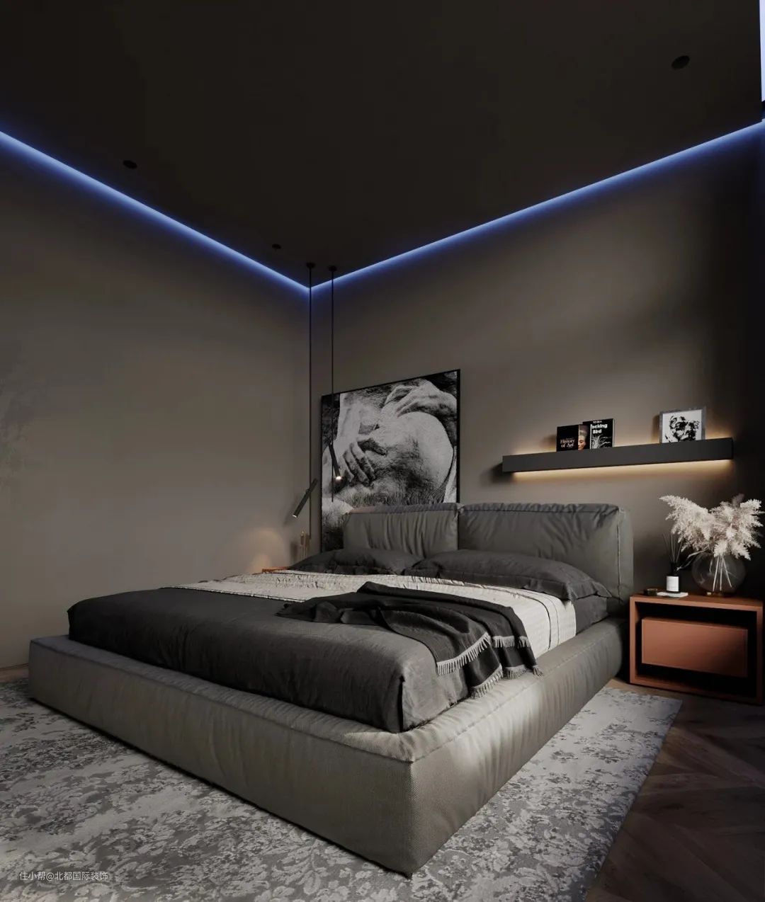 主卧的颜色采用了比较有高级感的灰色