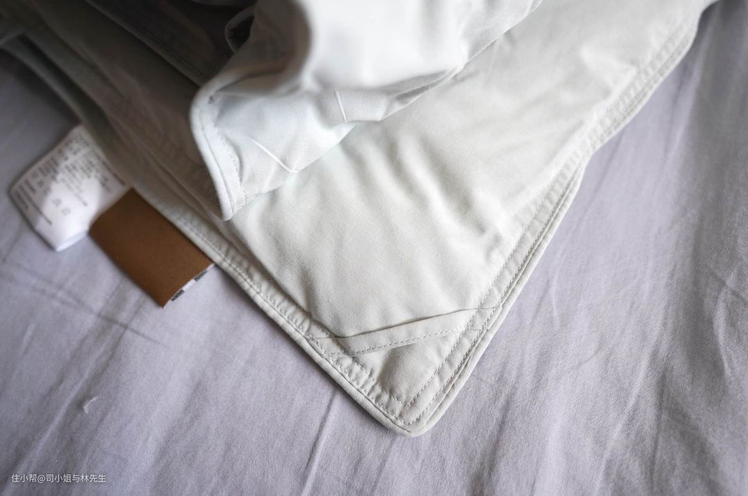 ▲细节上,8H抗菌石墨烯抗菌混合白鹅绒被还设计固定被套的扣袢,方便固定被罩。包边方便也做的不错,细节到位,针脚细密整齐没有跳线。