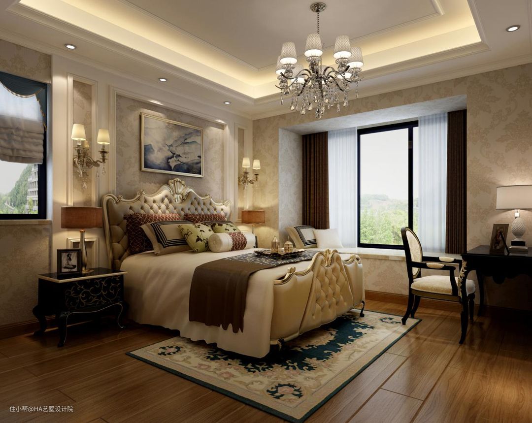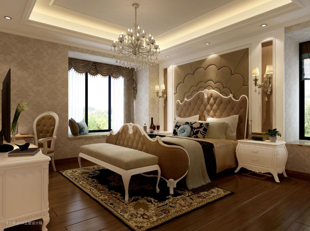 在继承起居空间的设计手法的同时,卧室空间在设计上更加关注业主的休息体验。地面铺装从地砖改为实木地板,给人更柔软温和的感受。家具和饰品的选配方面,虽然在造型上依旧使用充满欧式风情的曲线,但是表面没有使用金色装饰线条,整体感受更加素雅,减少了视觉冲击,能让人更放松,获得更好的休息。
