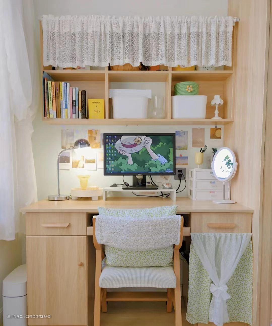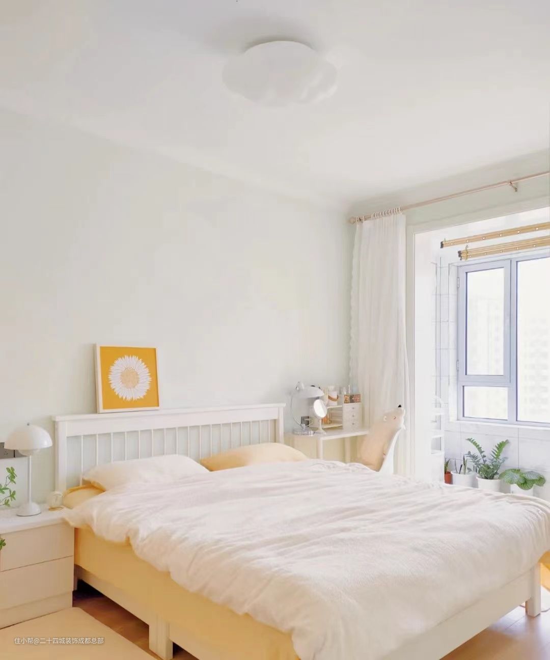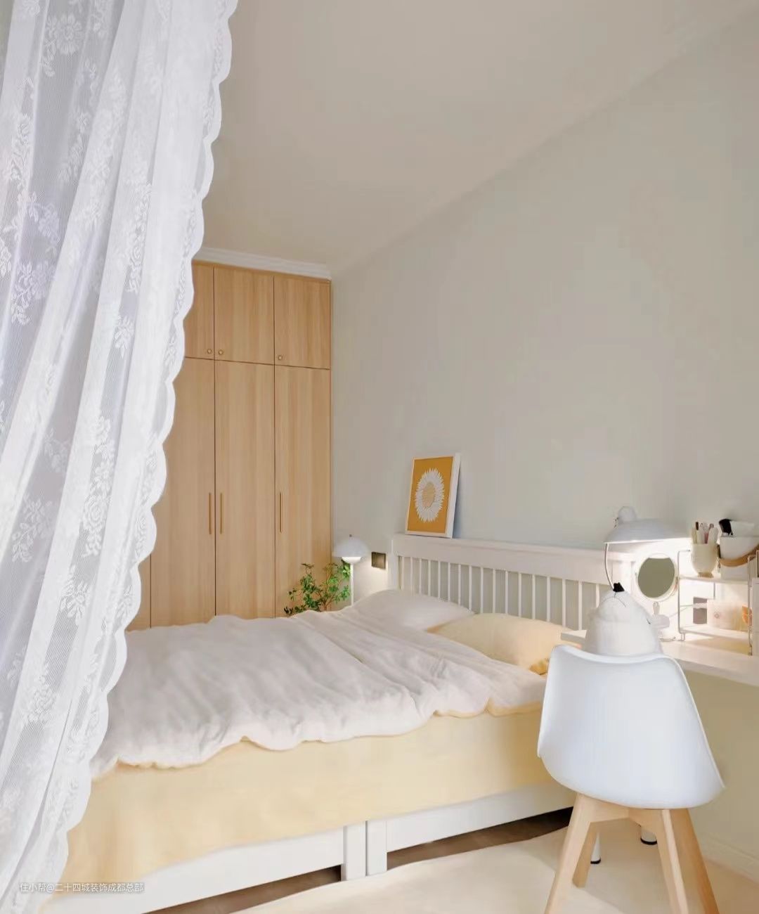 这间房本来是给女儿准备的,但孩子还小,不在这个房间睡觉,平时都是大人在用,就按照女主的想法布置了,比较清新少女。