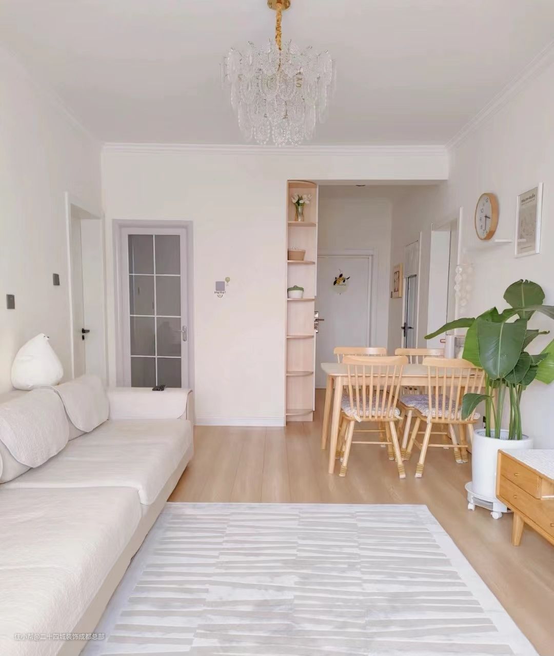整体的装修都比较简单,原木色的地板,搭配白色的墙面和顶面,顶面一盏带金色的水晶吊灯是整个空间的亮点,打开后,亮晶晶的,非常的好看,而且时尚感十足。简单的刷白白搭配好,也能很好看。