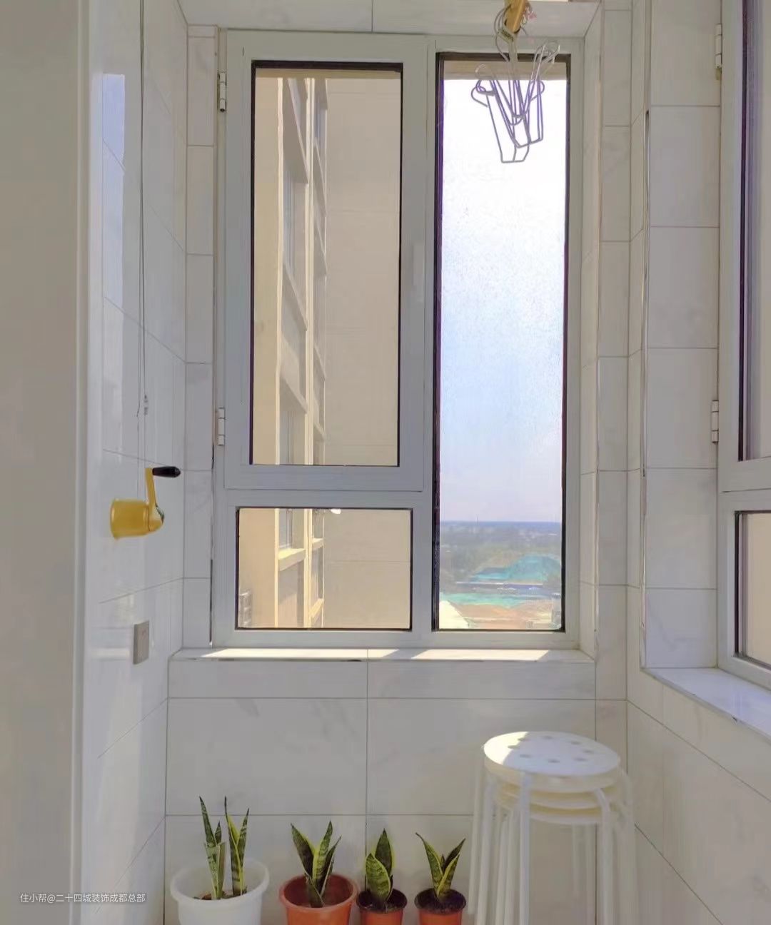 阳台的另一端是一个窗户,墙面什么都没有做,让阳光直接照进阳台,在窗户下种了几盆虎皮兰,阳光很好,长得生机勃勃。