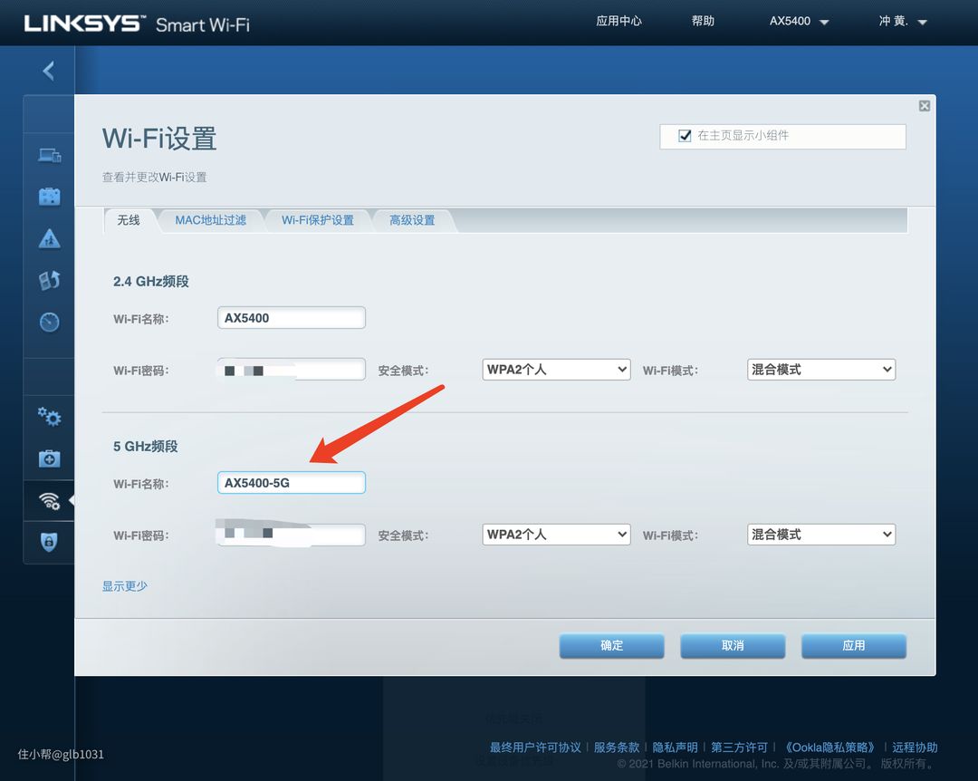 这里也提醒如果你也是使用双频路由器的话,可以手动把Wi-Fi名称分开,这样可以方便智能设备连接。一般在路由器设置界面下的Wi-Fi设置中找到关于Wi-Fi名称的设置界面。