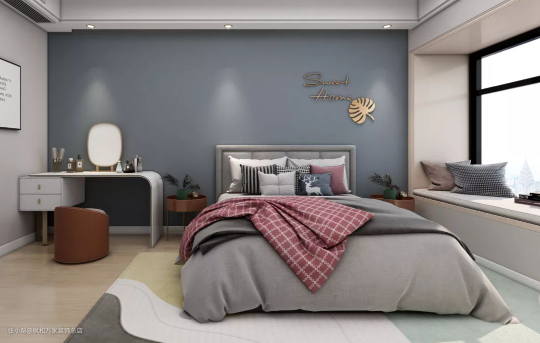 主卧床头背景上灰乳胶漆做成了背景墙 ,简洁的经条左侧摆放梳妆台,却给人一种纯洁浪漫的感。
