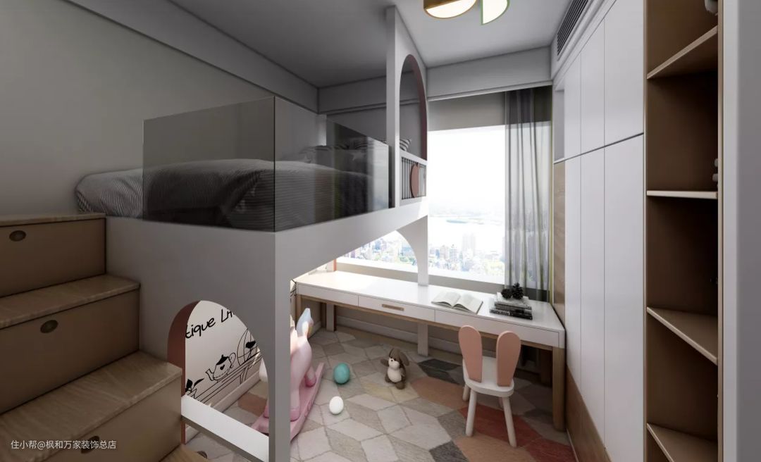 儿童房粉白色的墙面与软装点亮了空间,使空间显得更加俏皮与可爱 ,双层床更加实用,兼具收纳功能。