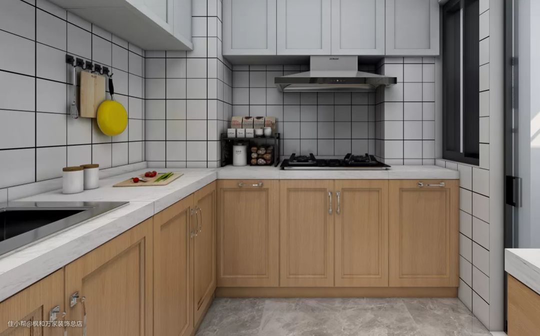 橱柜原木色门板,配以不锈钢本色的一字型柜门拉手,墙地面的灰色纹理瓷砖衬托白色无挡水边的台面,极致简约的厨房空间。