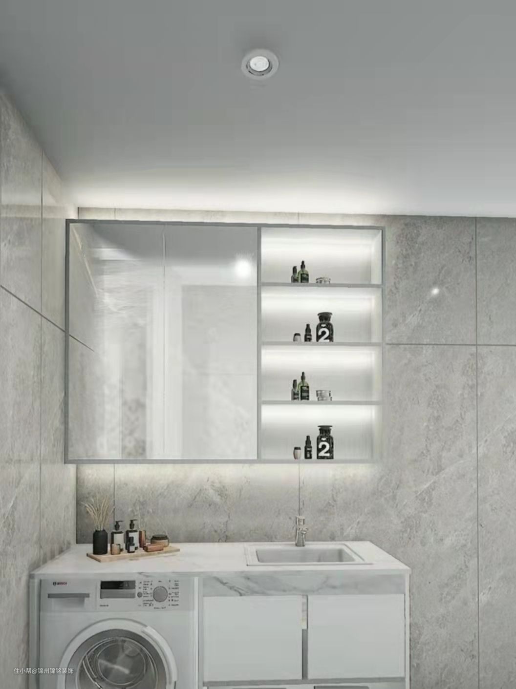 墙面是开放式组合镜柜,镜子下方可以放洗漱用品,洗衣柜上方还能充当临时梳妆区,不占用家人洗漱时间。