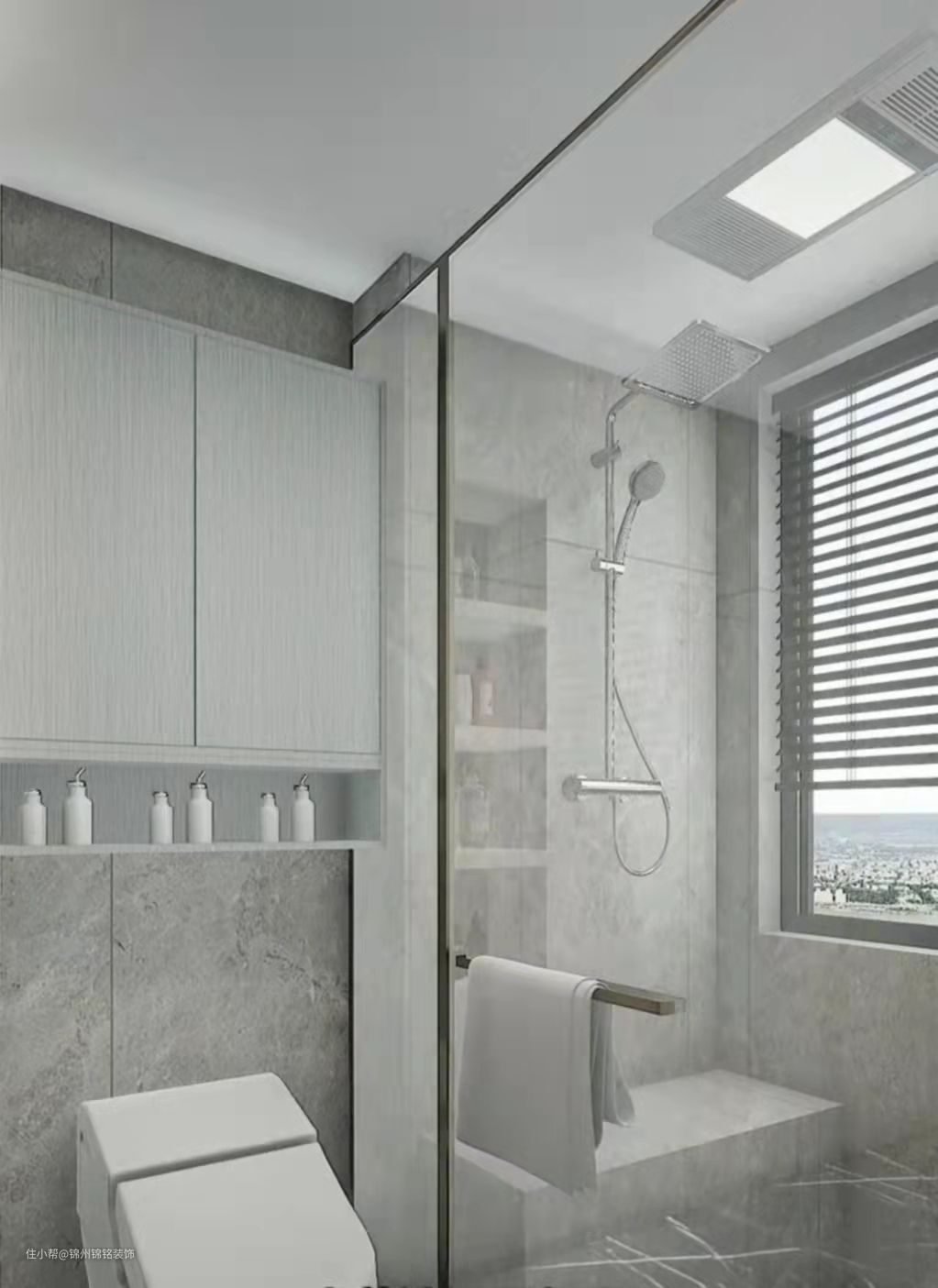 马桶上面做镜柜,不影响马桶使用,增加储物空间。淋浴房包管道,中间留洞可以放东西,底下的台子坐着洗澡更舒服。
