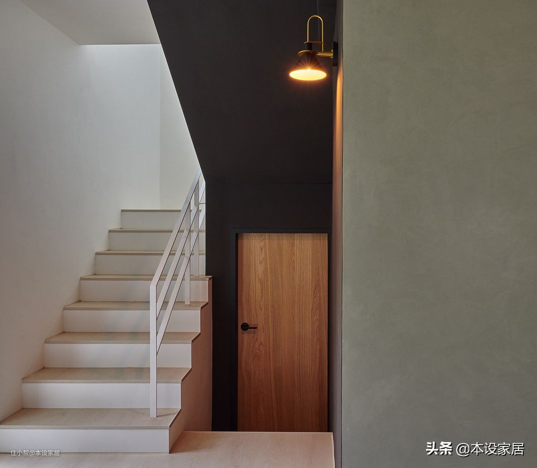 基本保留原有楼梯间踏步和护手,以及楼梯下方的卫生间,局部黑色漆的加入,在壁灯的渲染下,多了一份生活情调。