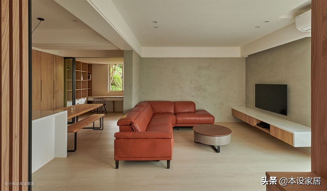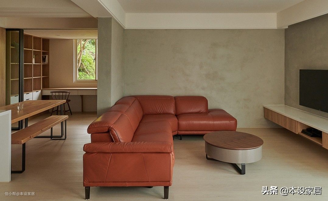 敞开式的客厅、餐厅布置在同一个空间里,引进更多的光线,视线也得到延伸。地面满铺木纹色地砖,耐磨,清洁方便。电视背景墙采用极简设计手法,干净利落。为了照顾老人水泥墙的居住习惯,墙面使用水泥漆,质感细腻,光线柔和,搭配一组橘棕色皮革沙发,看起来很有档次,距地12公分高扫地机来去自如。