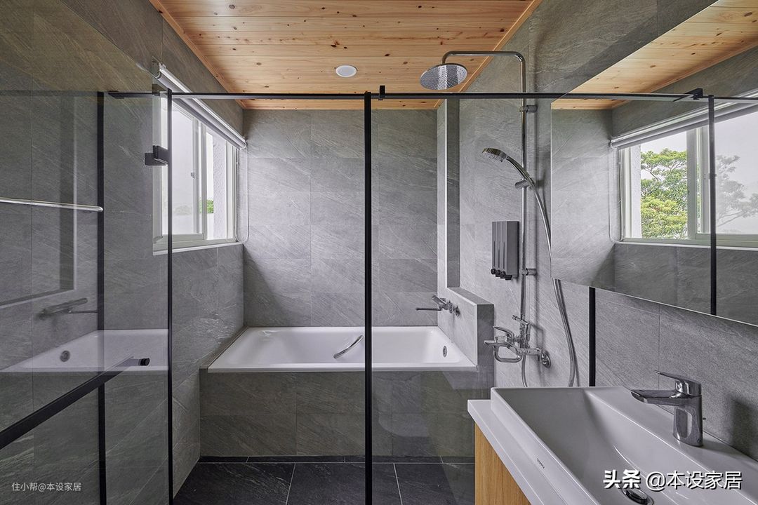 卫生间墙地面采用灰色砖,勾勒出一隅静谧天地,天花板防水松木的加入,中和了灰色调带来的冷峻感,畅快淋漓地洗个澡,又是美好的一天。