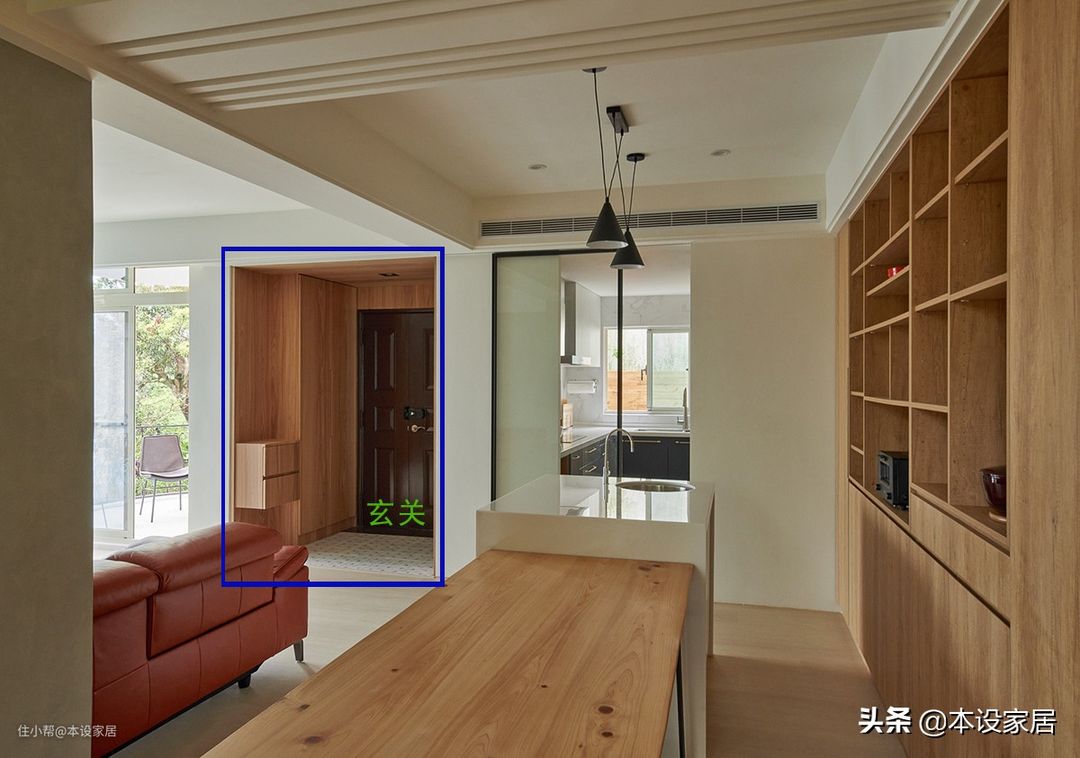 图中蓝线部分是玄关,地面铺贴30x30公分防滑小花砖,搭配温润的原木色鞋柜,营造出自然清新气息,也定调了整个空间现代简约原木的风格。怪不得老屋翻新后,邻居都不爱来串门了,这干净整洁的画面,让他们感到拘谨,有点无所适从。