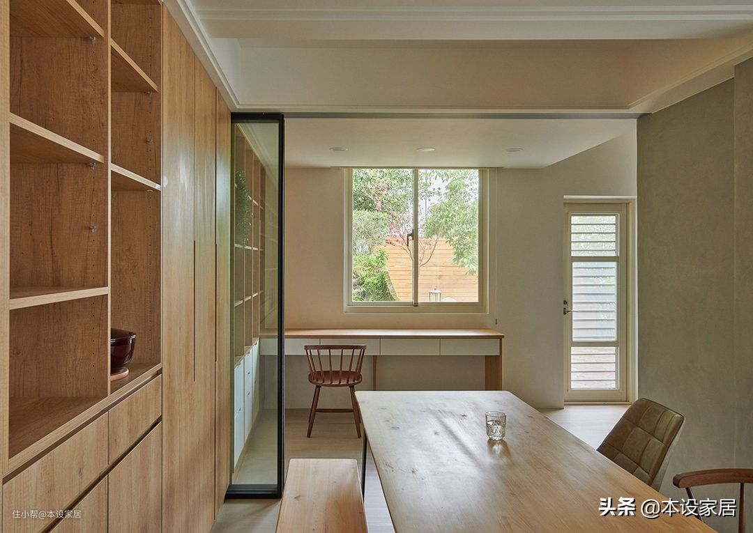 原来晾晒衣物的阳台,改造成多功能间,一张大长桌和柜子,在这里可以看书,做手工活,窗外绿树成荫,鸟鸣虫叫,最是人生好景色。
