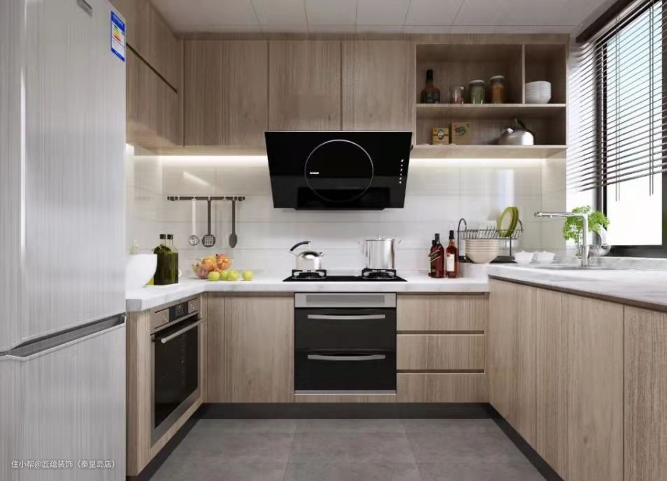 为了提升厨房空间的收纳储物空间,一 般在橱柜的.上方还会安装吊柜,用于收纳储备食品或厨具,这个厨房吊柜的深度- -般建议做到300mm就可以了,做太深了会伸出太多、容易撞头。