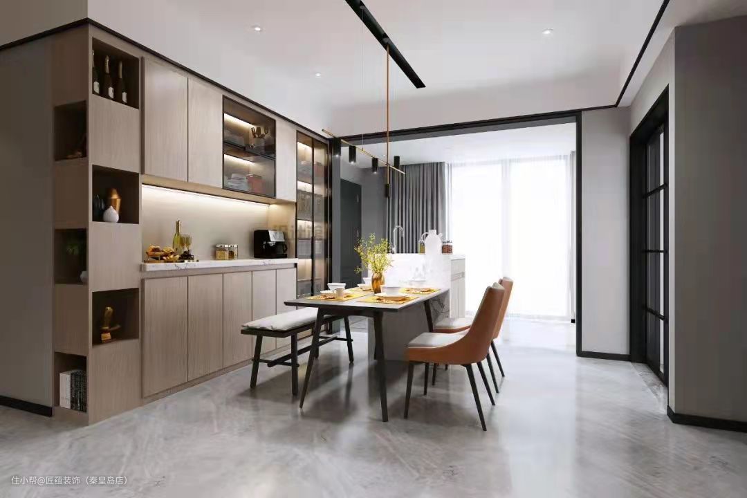 餐边柜主要是用于放置冷热水壶、小电器等,这些物品的尺寸一般不会太大,同时考虑到餐厅本身的空间尺寸相对紧凑,一般餐边柜 的深度是在350 400mm左右,如果要嵌入冰箱或烤蒸箱的话,可以根据餐厅整体设计适当做深;此外,为了提升餐边柜的实用方便,一般会在餐边柜做一个高度600mm以上的开放格,方便常用物品的放置收纳。
