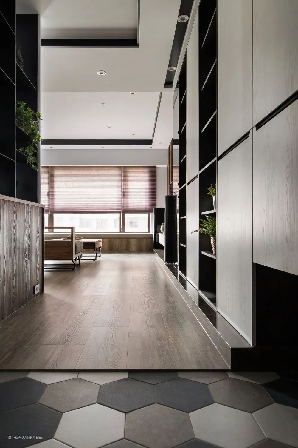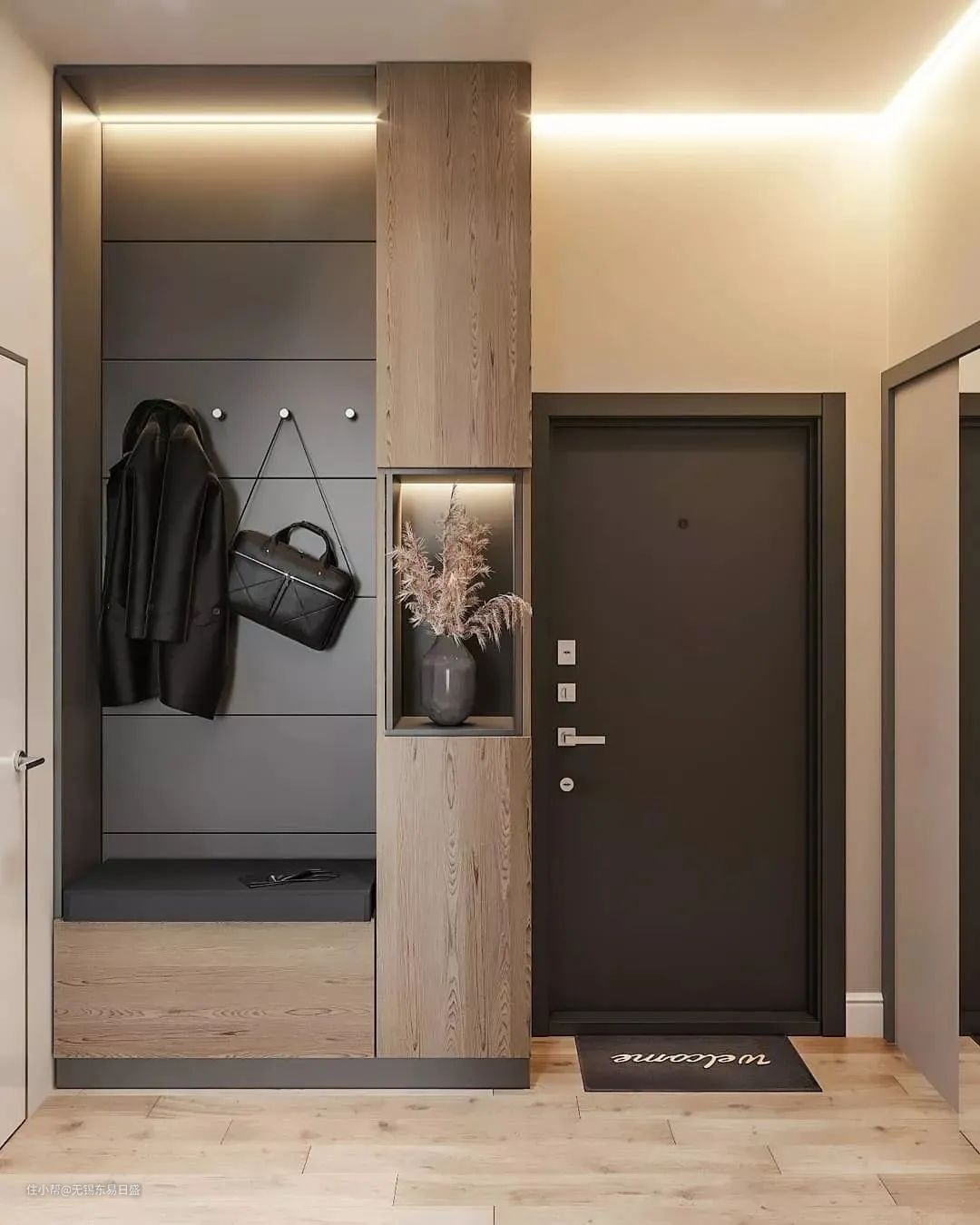 鞋柜中间留“凹槽”算是最常见的样式,留3个凹槽属于“教科书”级别,中间用来放钥匙、小物件,大一点的既是挂衣区又是换鞋凳,底部可以存放常用鞋。
