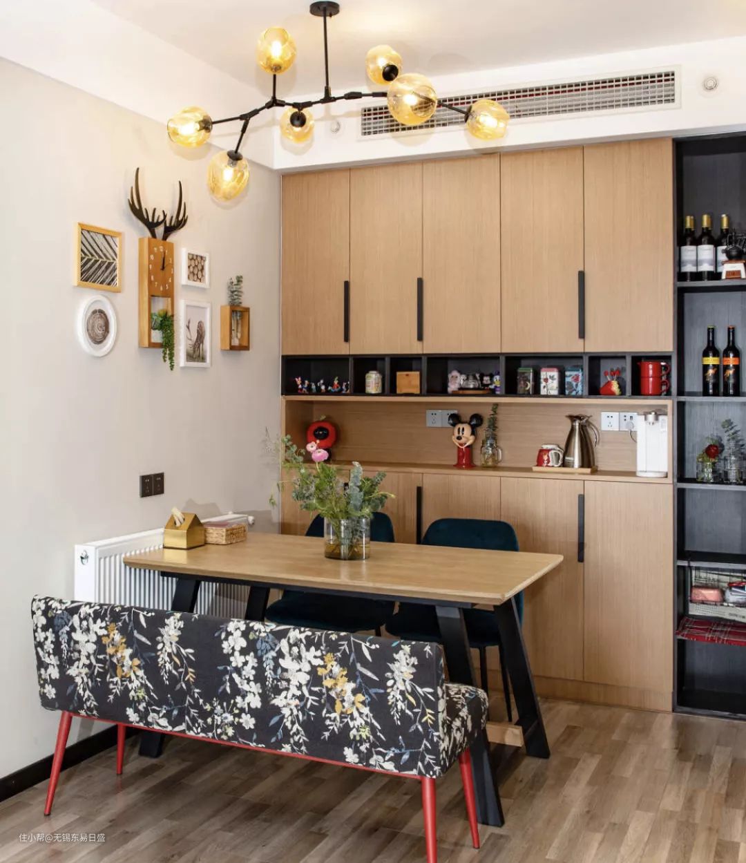 通常我们会选择三段式的餐边柜,上层可以放置不常用小家电以及零食,底部放置餐盘、杯子等,补充厨房的收纳空间,中间位置用来放常用物品,如小的饮水机、烧水壶,甚至微波炉等。