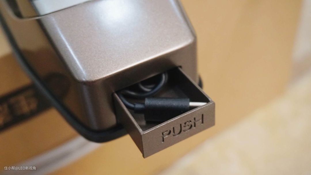 还有个最大不同是在底部,可以看到PUSH字样,这里是应急开门备用供电口。目前大部分智能门锁都会有应急充电口设计,传统的是采用那种应急电池,两个触点的那种,目前大部分是USB口,但都是需要蹲下去找那个口子的。而华为智选德施曼智能门锁,是在底部设计了一条Type-C口的线,而且支持OTG反向应急充电。也就是目前Type-C口支持反向充电的华为手机,都可以给门锁供电,其实实际是支持方向充电并是Type-C口的智能手机,都可以给门锁充电,在门锁电池耗尽时应急开门。