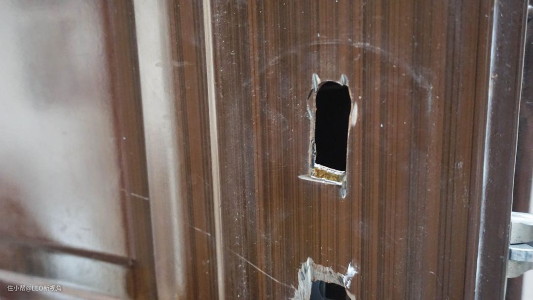 因为原来的门锁开孔并不很大,这次师傅用切割机将几个安装孔做了扩孔。
