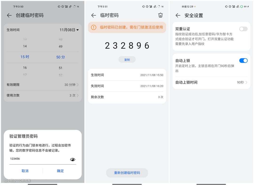 当然,也还是有不足的地方,比如支持华为手机用华为智卡开门,但如果是华为智能手表,目前还不支持;还有就是扭力设置、门锁语音设置和时间设置等,都是需要到门锁上设置,手机APP不能操作,希望这些问题未来系统升级后,可以得到解决。