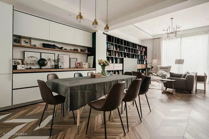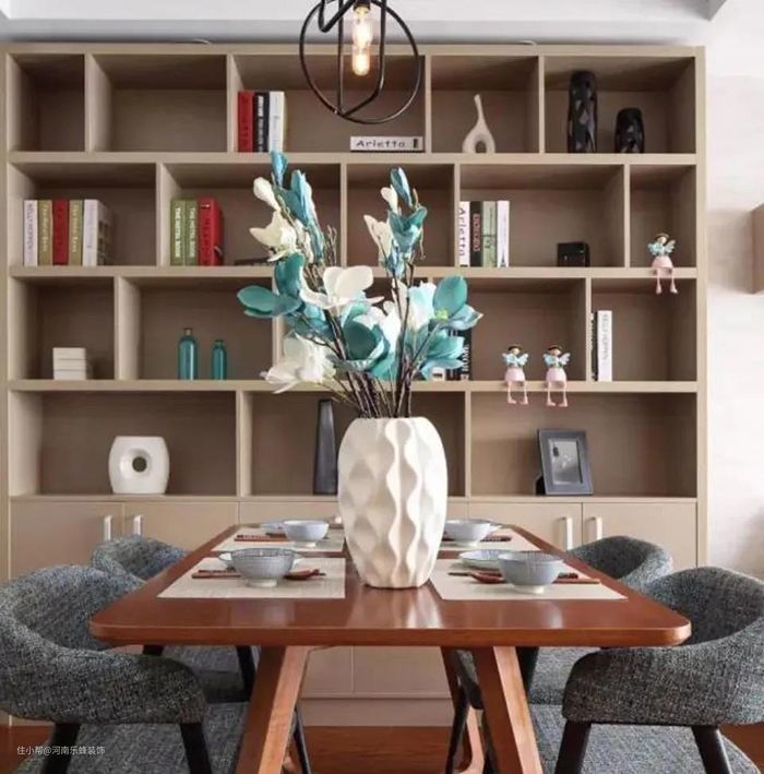 如果是客餐厅一体,喜欢在餐桌上正襟危坐地读书,也可以把书架墙放在餐厅。