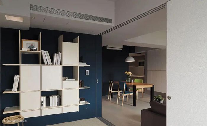 书架还可以用来分隔空间。厨房与客餐厅之间太挤,敲掉一面墙,用定制镂空书架做隔断,既保证了空间的通透,又能为家增加格调。