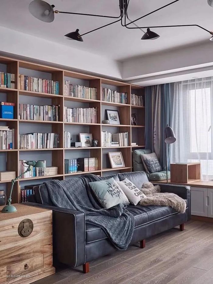 做到顶的厚重书架,书架旁边铺着大大的地毯,摆着懒人沙发……一进家门,书香气扑面而来,无形徜徉在知识的海洋。至于书架墙的位置,完全可以根据个人喜好来。