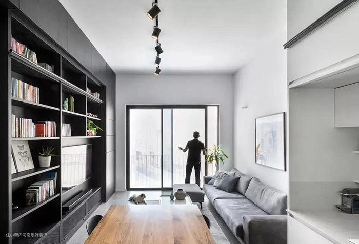 如果客厅空间不够,而且存书没那么多的话,一整面的书架墙就比较浪费,可以用长条矮柜代替,又便宜又实用。
