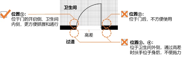 以卫生间内外存在高差的情况为例,在门洞附近的墙面上设置扶手时,扶手的位置和形式就非常讲究。
