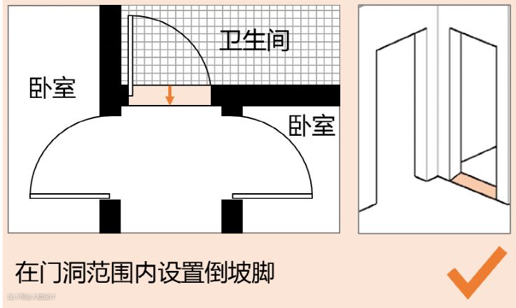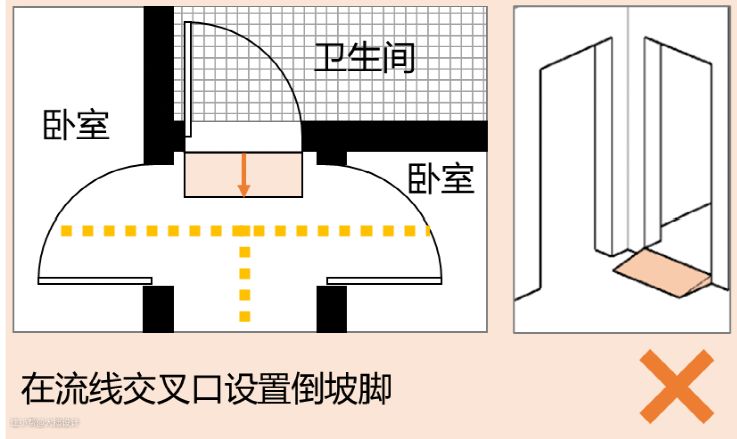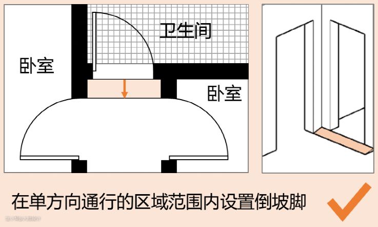 设置倒坡脚时,应注意其位置对主要通行空间的影响。有条件时,应尽可能将其设置在门洞范围内,或设置在单方向通行的区域,以避免影响其他方向的正常通行。