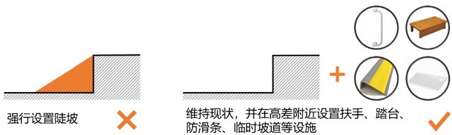 在这种情况下,如果强行设置陡坡,不但无法实现助行器械的顺畅通行,而且还可能带来更大的安全隐患。因此,对于这类高差,更加建议维持现状,并通过在高差附近增设其他辅助设施保证老年人通行的安全性和便利性。