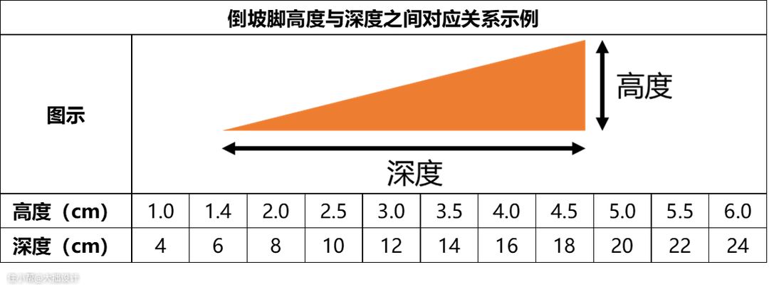 图片大多数成品倒坡脚都会按照这一尺寸规律进行设计,下表中以某企业的产品为例,展示了倒坡脚高度与深度之间的尺寸对应关系。可以看到,对于几厘米的小高差,大多可以在十几到二十厘米的深度范围内得到妥善处理。