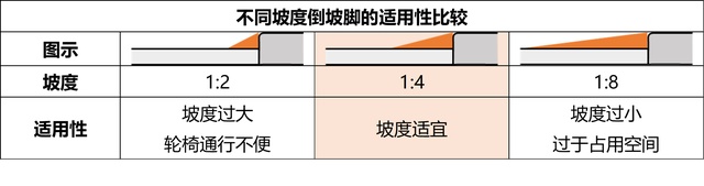 倒坡脚的坡度关系到助行器械通行的便利性,以及设置倒坡脚所需要占用的空间。相关研究表明,对于几厘米的小高差,倒坡脚的高度与深度之比控制在1:4左右(对应的坡度为14°左右)是比较适宜的,这样既方便轮椅通行,又不会占用过多空间。