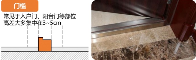 家庭环境当中,常见的地面高差主要表现为门槛、推拉门轨道、过门石和结构高差等形式,较多出现在卫生间、厨房、阳台和入户门等部位。