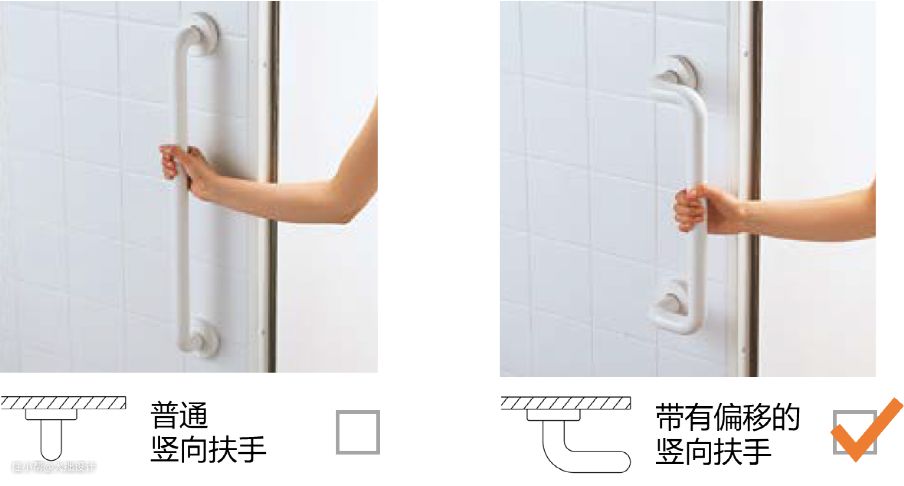 在扶手形式的选择方面,如果在门洞附近的墙面上设置普通的竖向扶手,使用时很容易出现左图中门框别手的情况,不便于施力。因此,更推荐采用右图所示的带有偏移的竖向扶手,这样更加方便施力。