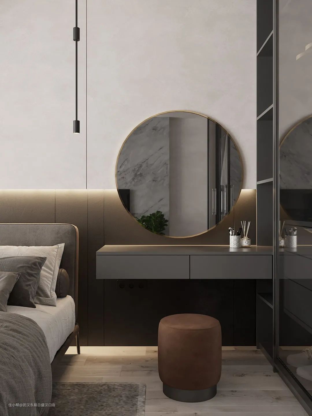 悬空的桌板或者薄柜可以当做书桌或梳妆台使用,没有桌腿的设计减轻了对地面的压迫,视觉上更加轻盈灵活,也更具高级感。